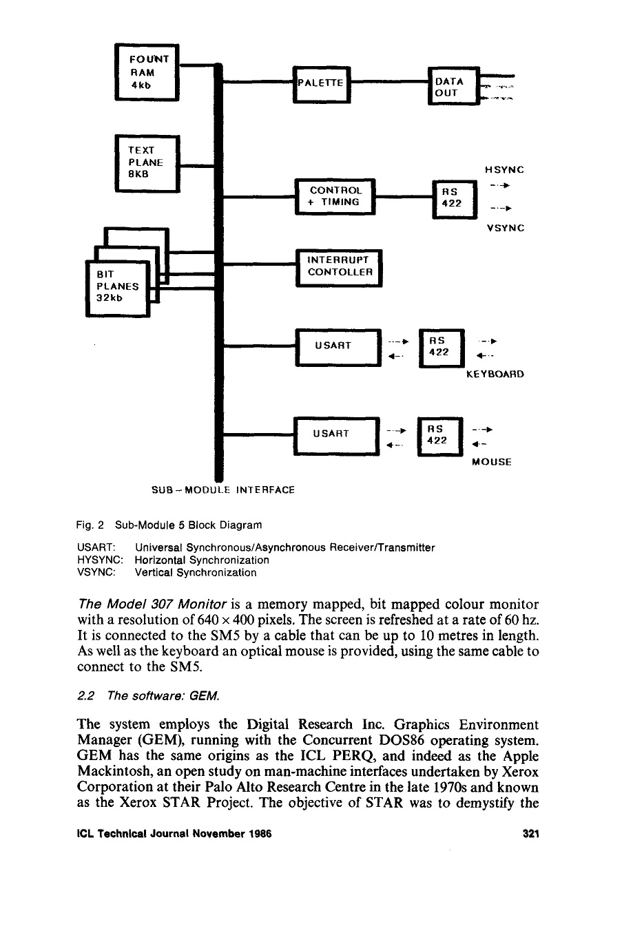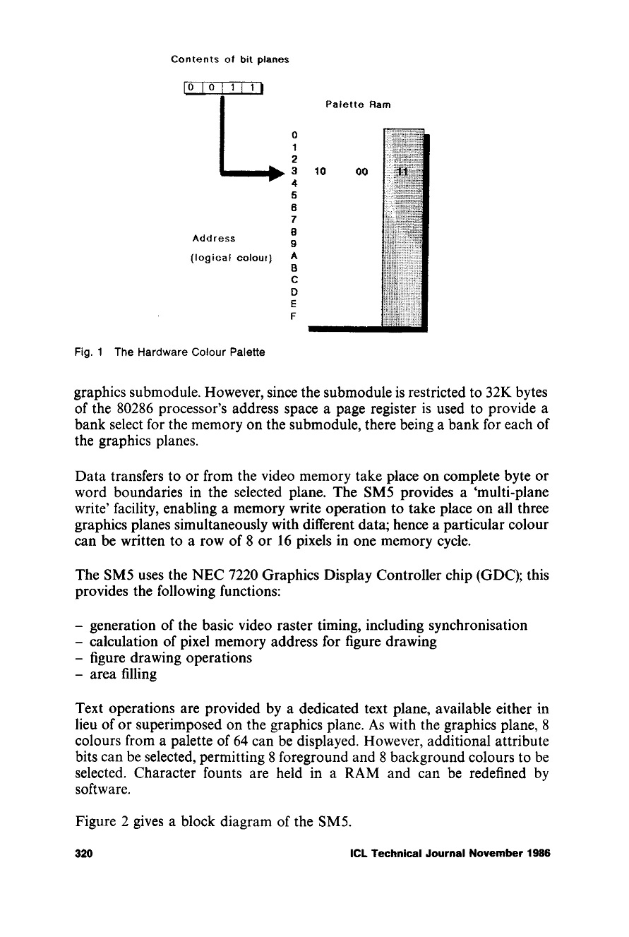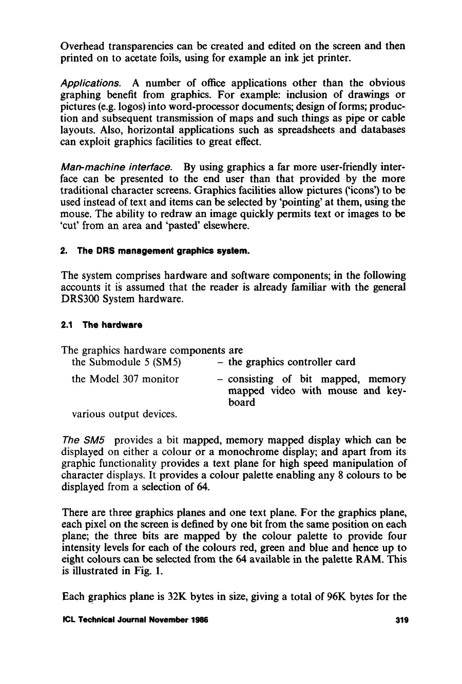 The machine has a SM5 (Submodule 5) graphical card, a high resolution bit mapped, memory mapped ICL Model 307 monitor plus ICL Models 305 and ICL Model 303 terminals.